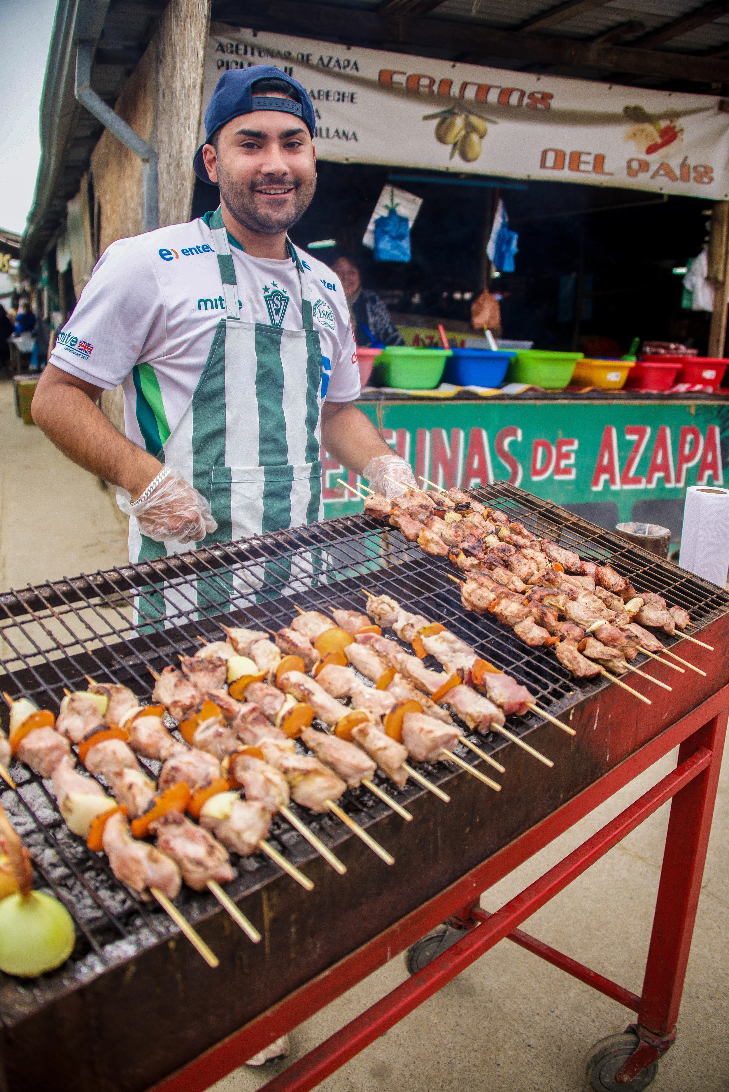 And there was food, lots of food. Young men stood by charcoal grills sizzling with anticucho – cubes of skewered, marinated pork and beef heart; women sold juices squeezed by hand to order; an old lady baked hot empanadas filled with stewed beef, onions, cheese and black olives in the back of her van.