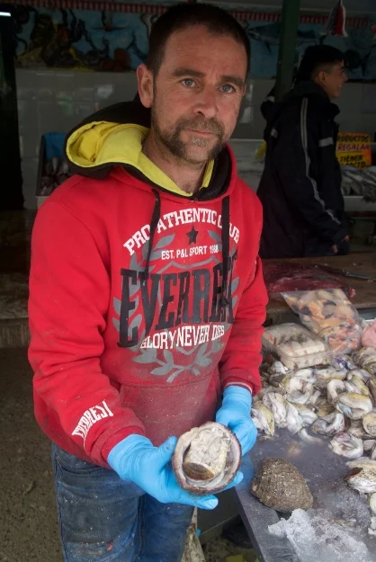Stacks of razor clams sat beside piles of thick, round abalone, oysters and scallops. Nearby, half an oil drum set atop an old shopping cart served as a grill, with a chunk of fish sizzling beside mussels the size of my hand, opening with puffs of briny steam. The fishmonger insisted I tear off a piece of fish and slurp down a mussel on the half.