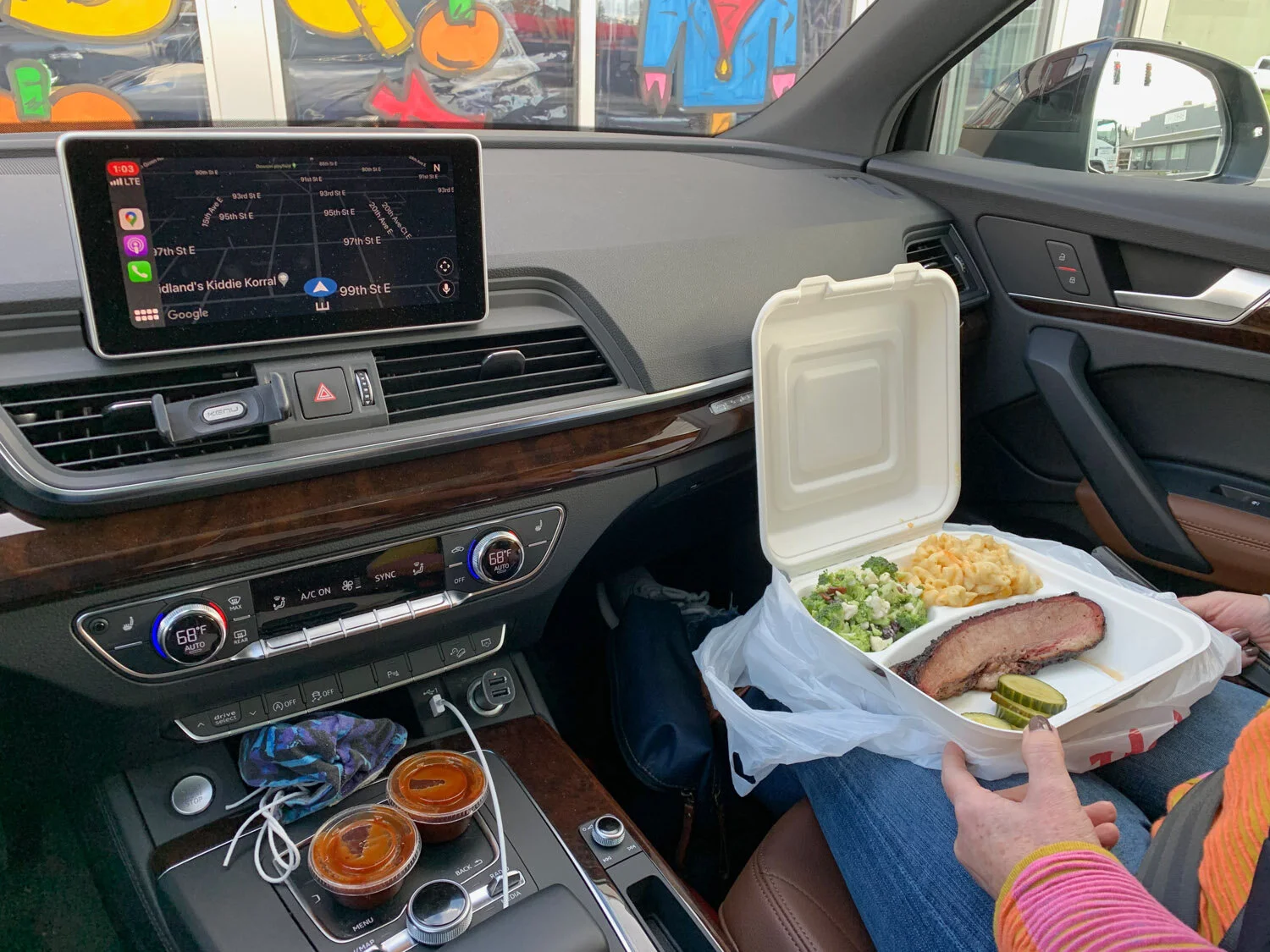 Some day our cars will again revert to the highway-hugging Wendy-Mc-Kingsters junk burger eating shelters they once were. But until then cars can serve as a venue for a great culinary experience. Because the act of eating good food in the car requires extra care and thought. You find yourself chewing a little slower and tentatively, savoring the tastes and avoiding the mess. This deliberate dining leads to a deeper appreciation of the food in front of the dashboard. Like I had while eating My 4 Sons BBQ in the comfort of my own, well-worn seat. The air temperature was exactly where I wanted it; the sound system adjusted just right. And in that moment the car seemed like the perfect place for such excellent food. And it smelled like BBQ paradise for the rest of the day.